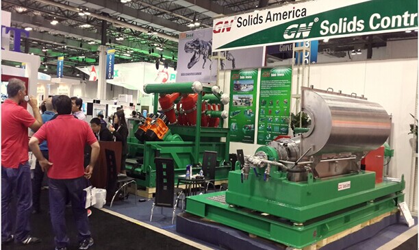 本次我公司參展的是一臺處理量達(dá)240立方米/小時(1056GPM )的泥漿清潔器和一臺GNLW553 - VFD是鉆井液離心機。GNLW553 – VFD離心機是一臺大體積大處理量的離心機,具有專門的變頻器和PLC控制系統(tǒng)進行快速處理操作。